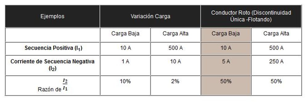Lo que distingue a la implementación ANSI 46BC es que el valor de NPS no es evaluado separadamente, sino que es comparado con el valor de corriente de secuencia positiva. Variaciones normales en la carga pueden causar cambios en los valores de corriente NPS vistos por el relé, como se aprecia en la Tabla 1. Variaciones en la carga durante un día típico de suministro de energía pueden resultar en valores altos de corriente de fase de secuencia negativa, pero no necesariamente implican una discontinuidad en algún conductor. El reto se presenta cuando se rompen uno o dos conductores, ya que esto no necesariamente aumenta la corriente de fase de secuencia positiva, causando que los relés convencionales de sobrecorriente o de falla a tierra no sean capaces de detectar la falla. I2/I1 es relativamente constante a variaciones de carga en sistemas trifásicos, sin embargo, una vez exista una discontinuidad, la relación aumenta rápidamente. En la Tabla 2 se detallan algunos de los valores típicos de un sistema de distribución trifásico.