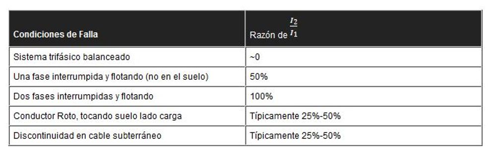 When three phase powerlines experience a discontinuity, the effective balance of current Cuando sistemas trifásicos experimentan una discontinuidad, el balance efectivo de voltajes y corrientes a lo largo de las tres fases es comprometido. Esta discontinuidad puede ser un conductor roto haciendo contacto con el suelo, o un fusible quemado en una o dos de las fases. Estas discontinuidades no necesariamente se traducen en sobrecorrientes debido que la impedancia a tierra puede ser alta o aproximarse a infinito (cable roto flotando). Cuando se aplica la protección de Secuencia de Fase Negativa a cualquier alimentador, el ingeniero de protecciones debe entender el principio de impedancia de secuencia de fase negativa, y luego aplicar los ajustes correctos basándose en múltiples casos de falla.