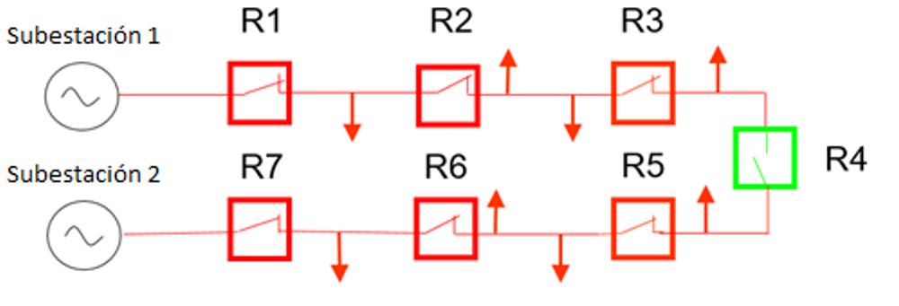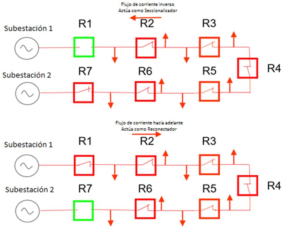 Cuando la corriente está fluyendo en condiciones de carga convencionales con un punto de conexión abierto, la coordinación no representa ningún problema. El reto se presenta cuando se pierde una fuente de suministro y el punto de conexión está cerrado (Figura 2). Este problema está relacionado con el cumplimiento de los requisitos de coordinación bajo un cambio de dirección del flujo de corriente. Un Reconectador moderno que puede identificar diferentes direcciones de corriente a través de la aplicación del componente de secuencia de ángulo de torque, puede actuar selectivamente como un Seccionalizador o Reconectador dependiendo de la configuración de la red de forma automática. Por ejemplo, si la subestación 1 se pierde, R1 se abre, pero R2 tendrá problemas con mantener la coordinación en una falla que ocurra aguas abajo en relación con el suministro de la subestación 2. Para enfrentar este reto, R2 se puede programar para actuar como un Seccionalizador en esta ruta de flujo de corriente para asegurarse de que se cumple la coordinación.